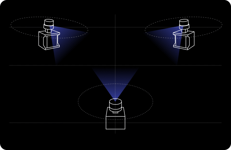 In a sensor cluster setup, multiple LiDAR sensors can be installed on walls, ceilings of any height -including low ceilings-or pillars to cover larger or more complex areas. The sensors operate as a coordinated system and are connected to a shared server, enabling comprehensive area coverage and accurate tracking across zones. This setup is ideal for environments with high traffic volumes or complex movement patterns, such as transportation hubs or public facilities.